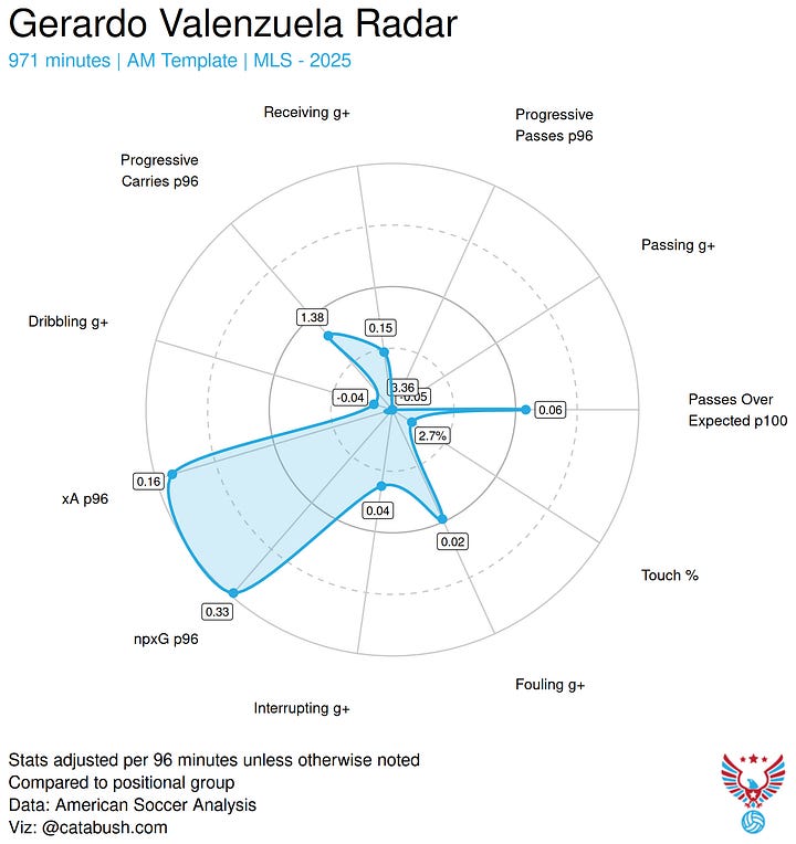 Dado Valenzuela’s goal and chance production in 2025 was indisputable. However, his fit into FCC’s best XI is less clear. At this point, Valenzuela seems to be more of a striker than an attacking midfielder as is clear in the data.
