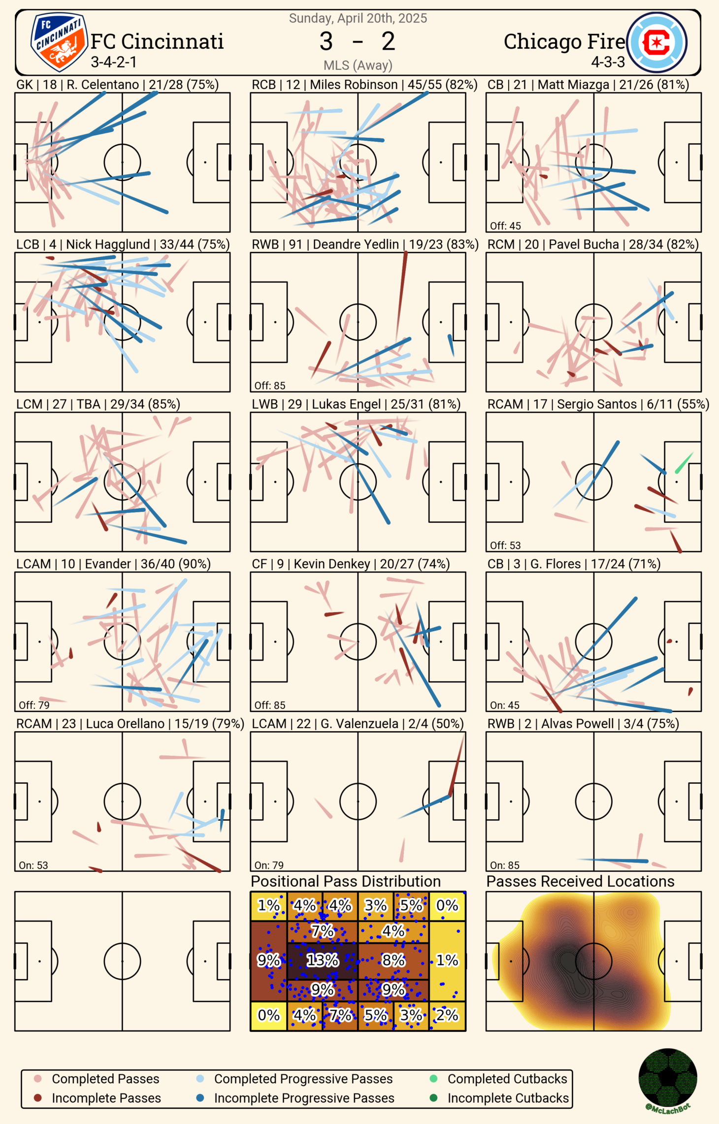 FC Cincinnati’s 3-2 win at Solider Field over an improved Chicago Fire team showcased a slightly different game plan than what we’ve seen so far over the course of 2025. Instead of looking to build up in possession, the Orange and Blue played more direct, getting the ball to its attacking players in space to run at defenders. FCC still didn’t play great. The Fire created just about the same quality of chances in open play as the Orange and Blue and won a penalty to make the game a little close for comfort. However, FCC found a way to win despite not playing its best and, importantly, there are some positive takeaways to be had.