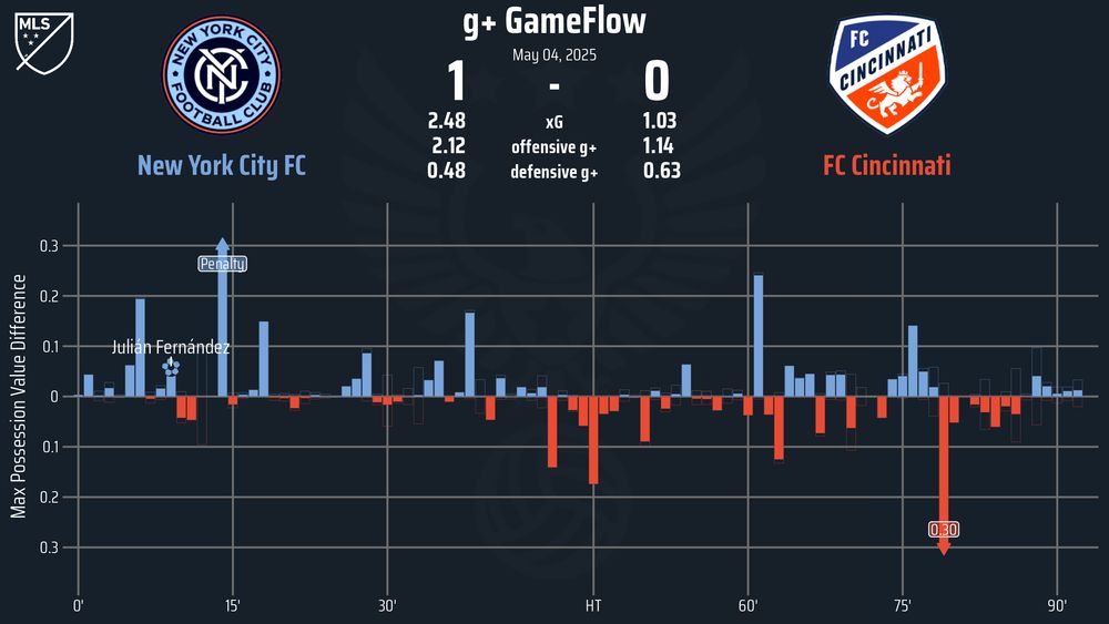 Unfortunately, NYCFC largely had answers for FCC’s plan and enjoyed even more success playing that way than the Orange and Blue did. The Pigeons matched FCC’s starting shape with three nominal centerbacks of its own and ran its own counter attacking mainly down its right wing, where Julián Fernández often found himself in tons of space.