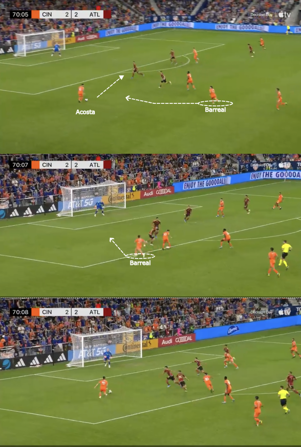 Barreal and Acosta combined to offer too many options to defend comfortably. Here’s Barreal making a distinctly un-fullback run on the break, looking to crash the middle of the box after an Atlanta United turnover. However, after seeing that Acosta is looking to cut in-field, Barreal bends his run back to the left. Atlanta’s defenders, rightfully wary of Acosta’s ability to shoot after cutting inside to his right, look to cut off that option. However, that means no defender tracks Barreal and he’s left with a wide open shot, which unfortunately went over the bar.