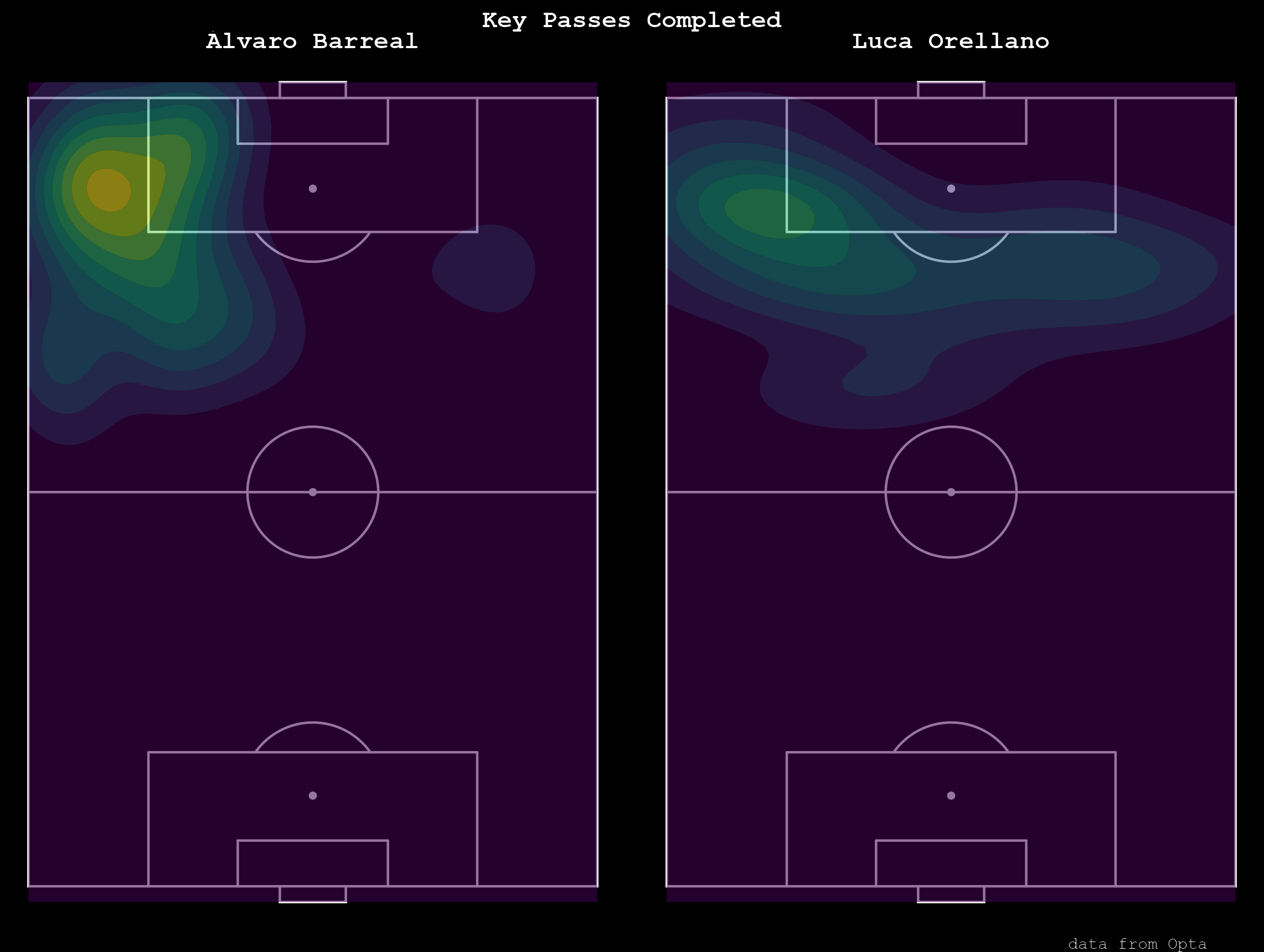 In progression, Orellano and Barreal played similarly large roles, just in different ways. Whereas Barreal completed more progressive passes, Orellano carried the ball up the field on the dribble.