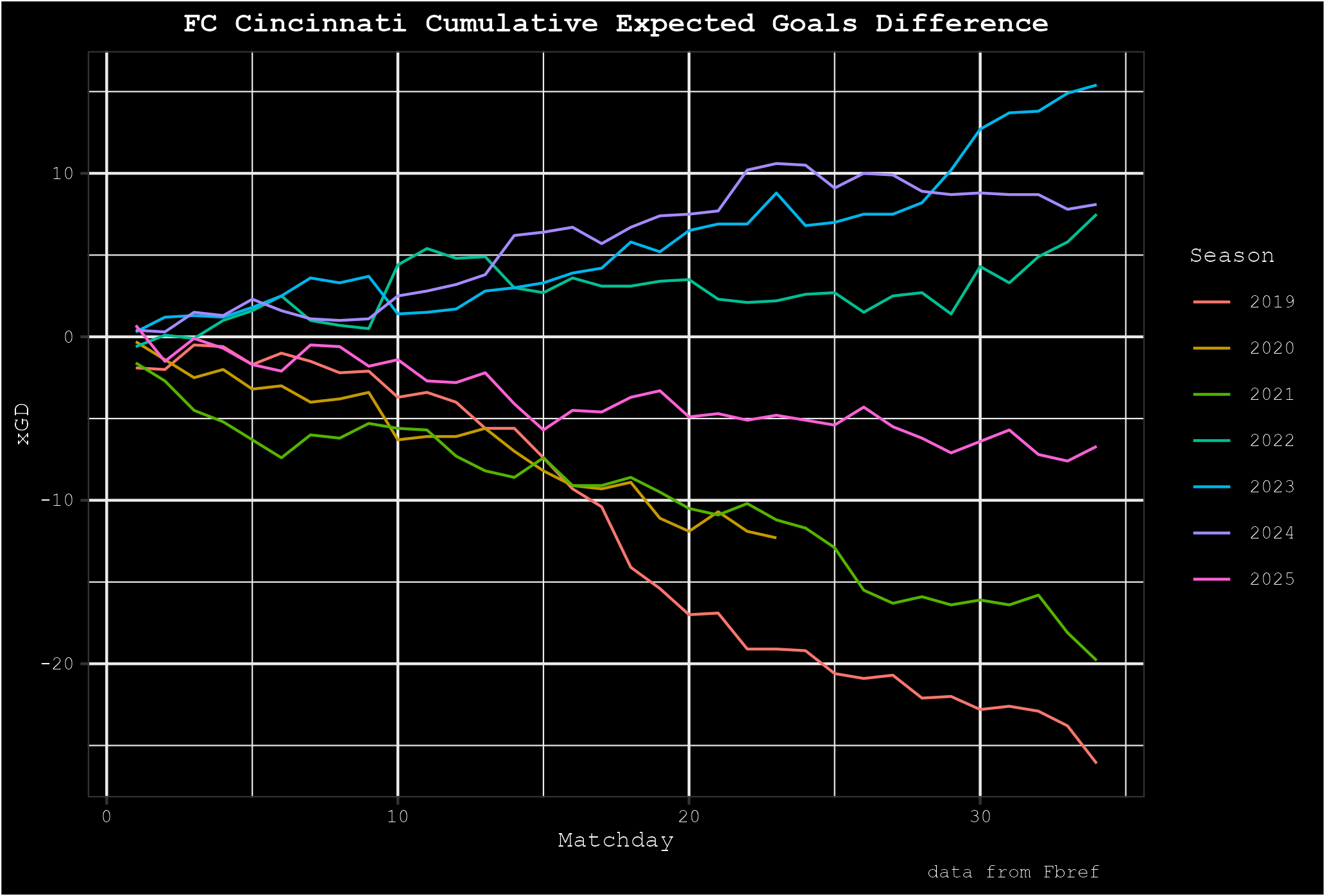 The 2025 season was FCC’s worst under Chris Albright and Pat Noonan in terms of the team’s expected goal difference. Yes, I know the game isn’t played on a spreadsheet but I think the eye test agrees. We’re not talking about a return to the Orange and Blue’s truly dire first few seasons in Major League Soccer but the team’s xGD in 2025 ranked 22nd in the league per American Soccer Analysis data. Expected goals remain the best predictor of future success in MLS1 and FCC allowed more than it created last season, and the disparity was a major step back from the first three seasons under Albright and Noonan.