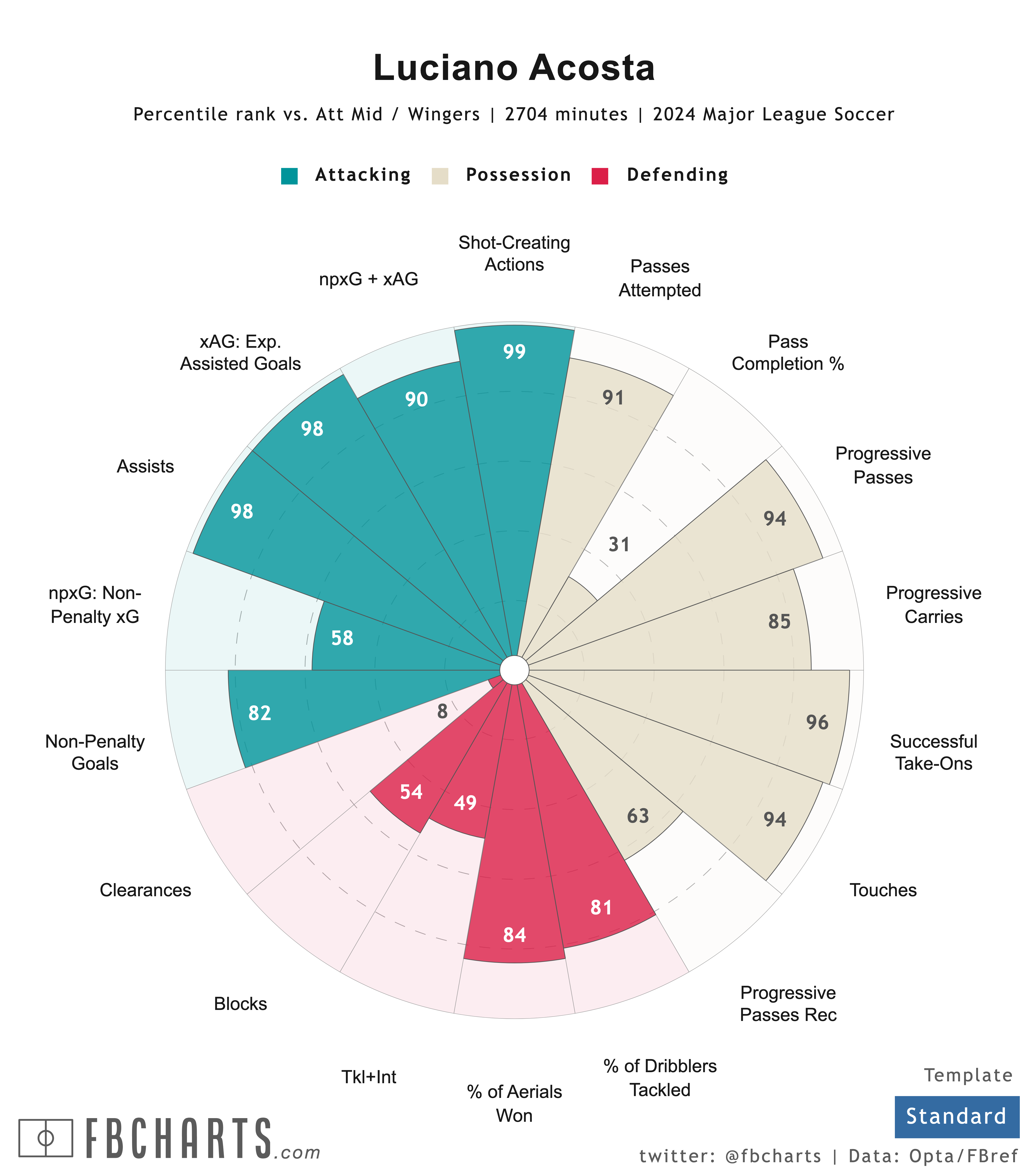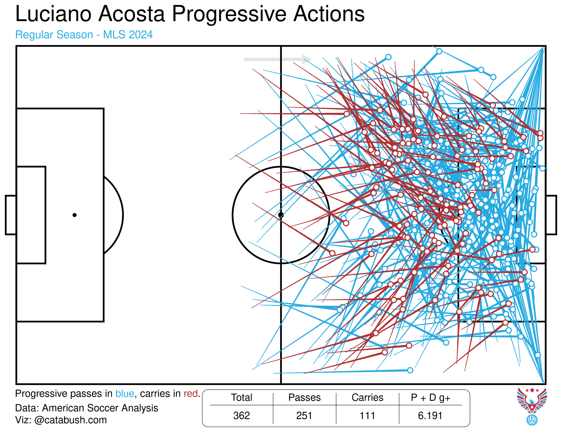 In Orange and Blue, Acosta dominated the ball, almost single handedly moving it up the field by either passing it to teammates or dribbling it himself. Acosta was also a consistent option to receive the ball from teammates making forward passes. Once in the final third, Acosta was an attacking hub, creating shots for himself and teammates and opening space for others with his gravity.
