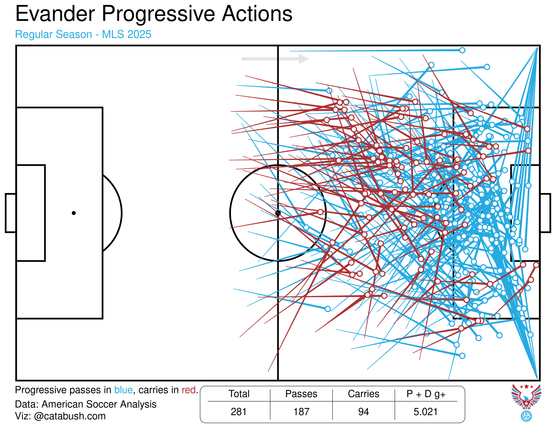 For Evander last season, many of his dribbles moved the ball closer to the box but not into truly dangerous areas. In an ideal world, Evander would be the one receiving a pass in the final third, near the top of the box, rather than the one getting it there.