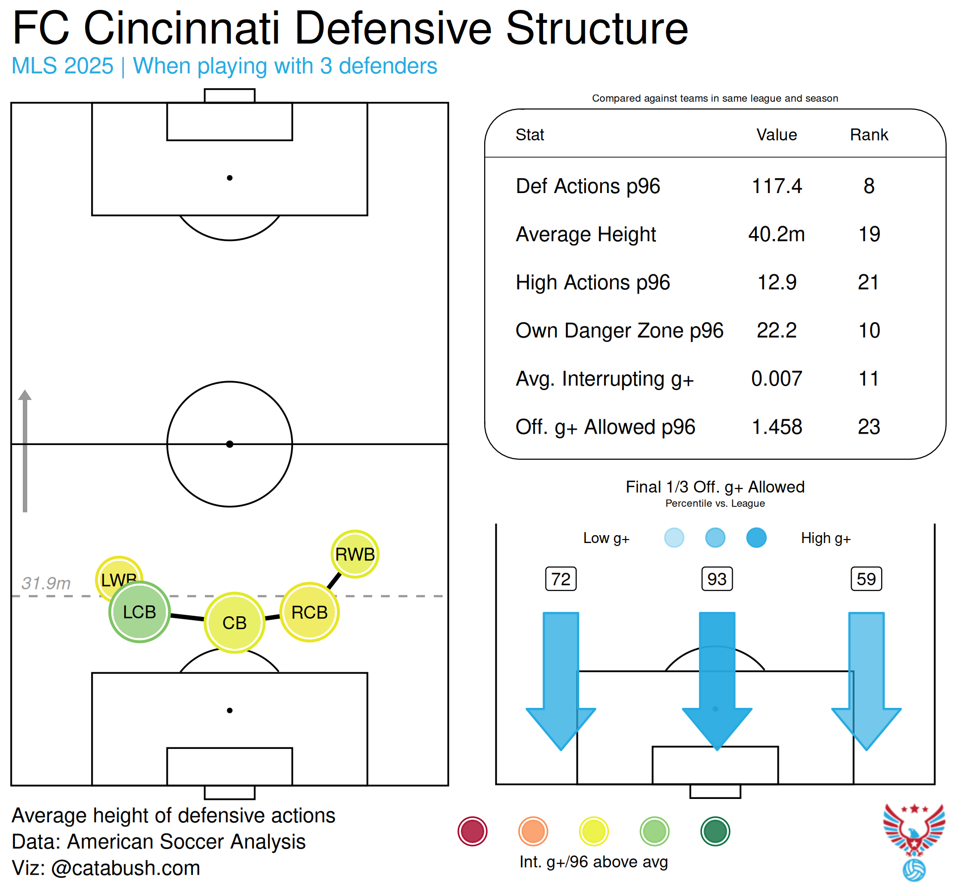 Looking at Cata Bush’s awesome visualizer at American Soccer Analysis, other ASA data, and Fbref, FCC was worse defensively in 2025 than in 2024 in some key defensive categories: