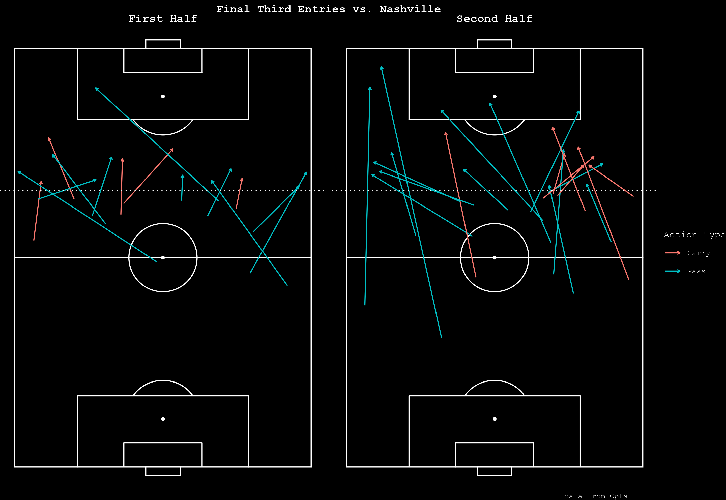 Luca Orellano benefitted as he could occupy a wider position. In his post-game press conference, Noonan said after subbing out Hagglund at halftime, the team, “changed our press that allowed Luca [Orellano] to deal with Lovitz and then we were going to have Sergio deal with Bauer.” Orellano was much more involved offensively in the second half, especially on the dribble, and occupying the wide space instead of the half-space, he could receive the ball facing Nashville’s goal more often and drive forward.