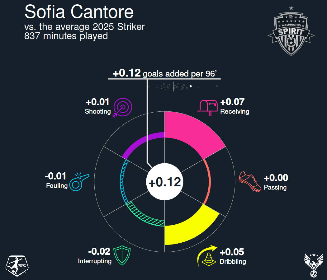 As the team adapts to a post-Croix Bethune world, having another player offering some low-block lock picking, either on the ball or with off-the-ball movement makes sense. Cantore can play across a front three but could be the preferred starting striker option against opposition intent on ceding possession and daring Washington to create scoring opportunities in tight spaces.