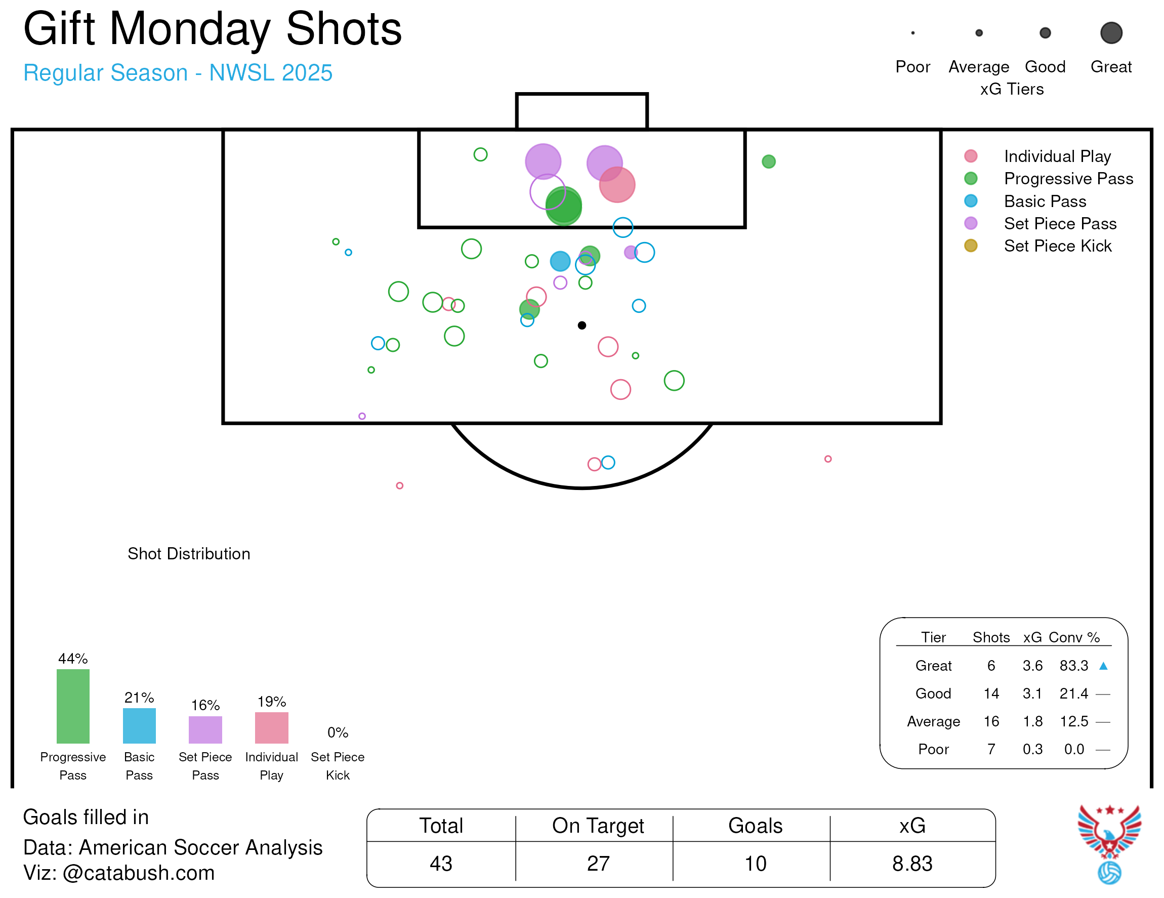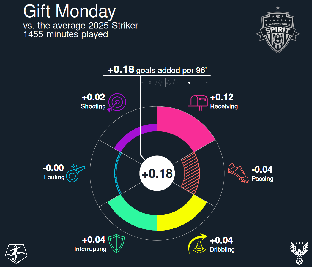 But Monday provides a different, but also valuable, threat in the box against a compact defense which was evident on Friday night, too. She enjoyed a breakout season in 2025 because she demonstrated an ability to consistently take shots from dangerous locations. It sounds simple but it's the most important thing a striker can do. And Gift Monday was very good at it.