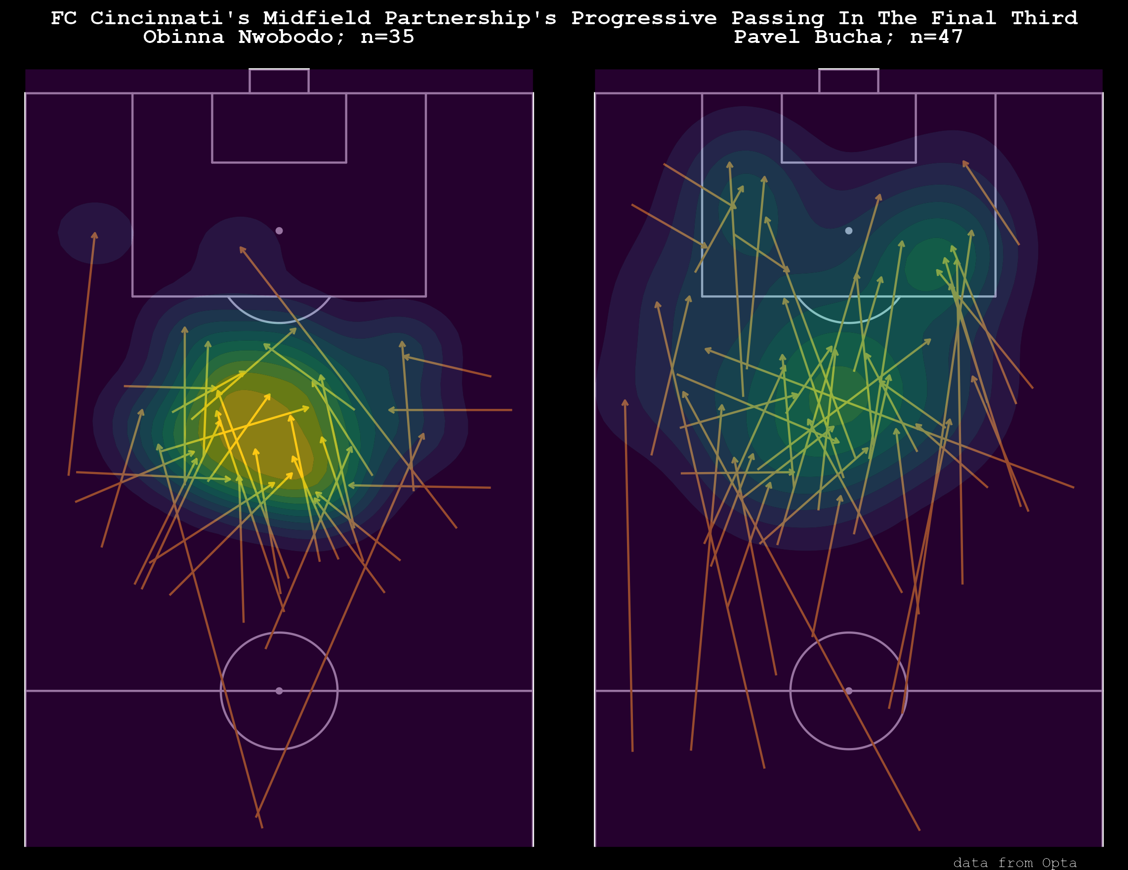 Because FCC’s attack was so thoroughly dominated by Acosta and Luca Orellano’s usage, Bucha played a more reserved role in actually finding teammates open to take shots or to make an attempt on goal himself. Bucha finished the season with just 1.87 expected assists according to American Soccer Analysis data.