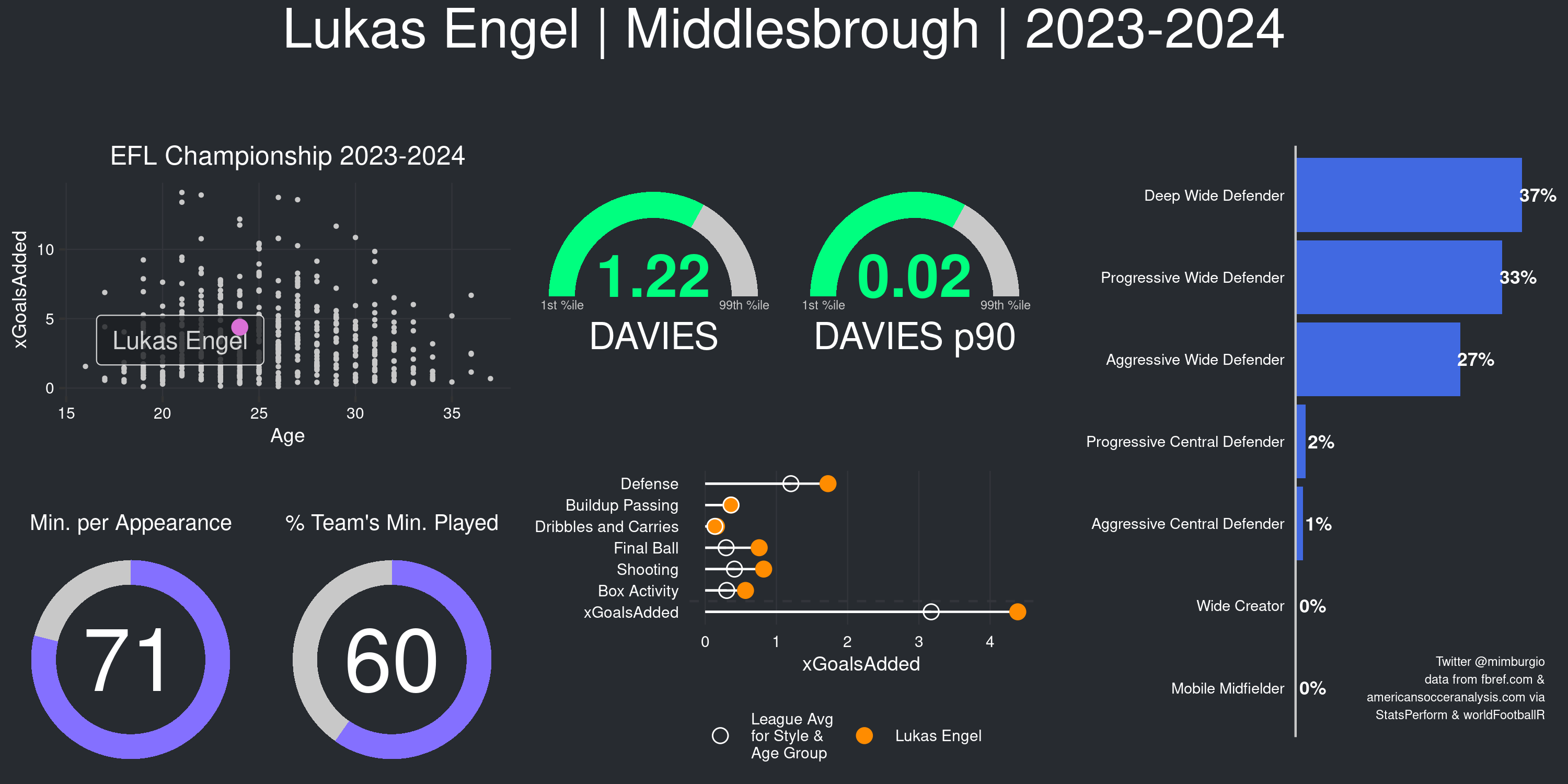 Mike Imburgio’s DAVIES, which attempts to identify roles based on statistical profiles, classifies Engel as more of deep defender than FCC has featured since 2022.2 At Boro, Engel provided some ball progression but not at the level that we’ve become accustomed to from players in the position. Nor does he appear as appear to be as threatening on the dribble but we’ve definitely been spoiled with Barreal and Orellano.