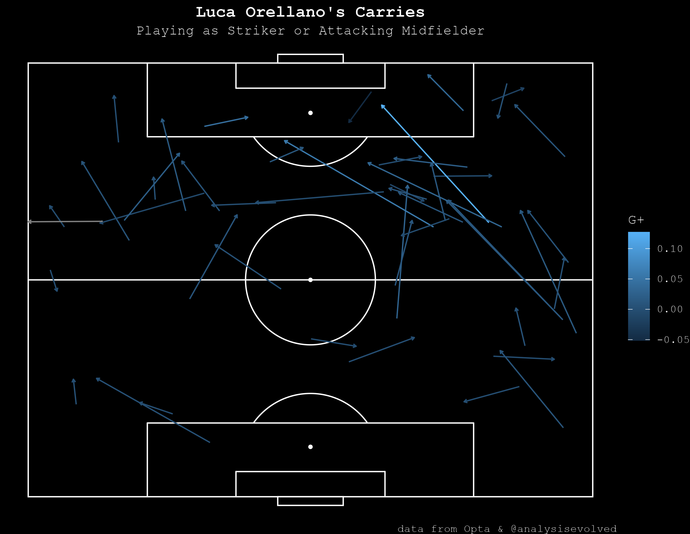 Drilling down into the data, the explanation is pretty simple. Starting Orellano higher up the field puts him in position to do the things he’s good at, dribbling and passing, mainly, closer to the opponents’ goal while putting him in positions to defend less.