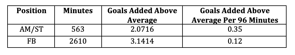 These numbers are about as precise as I can make them. Opta, and then American Soccer Analysis, determine a player’s general position during a game using a variety of information. It isn’t exact but, in this case, it’s better than nothing. ↩