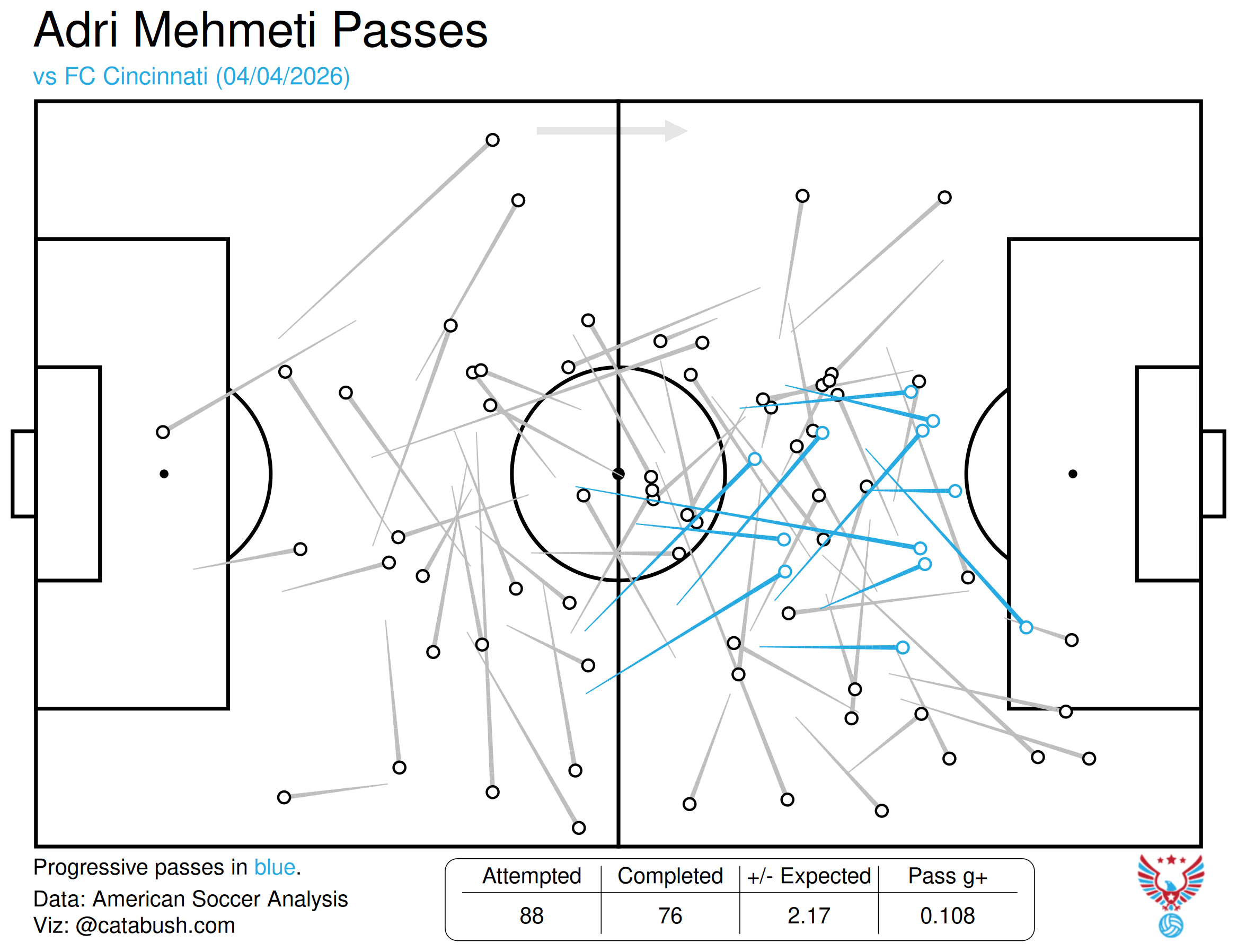 In providing a constant countering threat, Denkey and Evander allowed the Red Bulls to nearly always have a +1 advantage in midfield when NYRB was in the final third, too. Ronald Donkor, Emil Forsberg, and Adri Mehmeti consistently outnumbered Pavel Bucha and Samuel Gidi. Mehmeti, frequently the deepest lying player in the Red Bulls' midfield triangle, was able to dictate play in FCC's attacking third because he had so much time, and space, to find and play the ball.