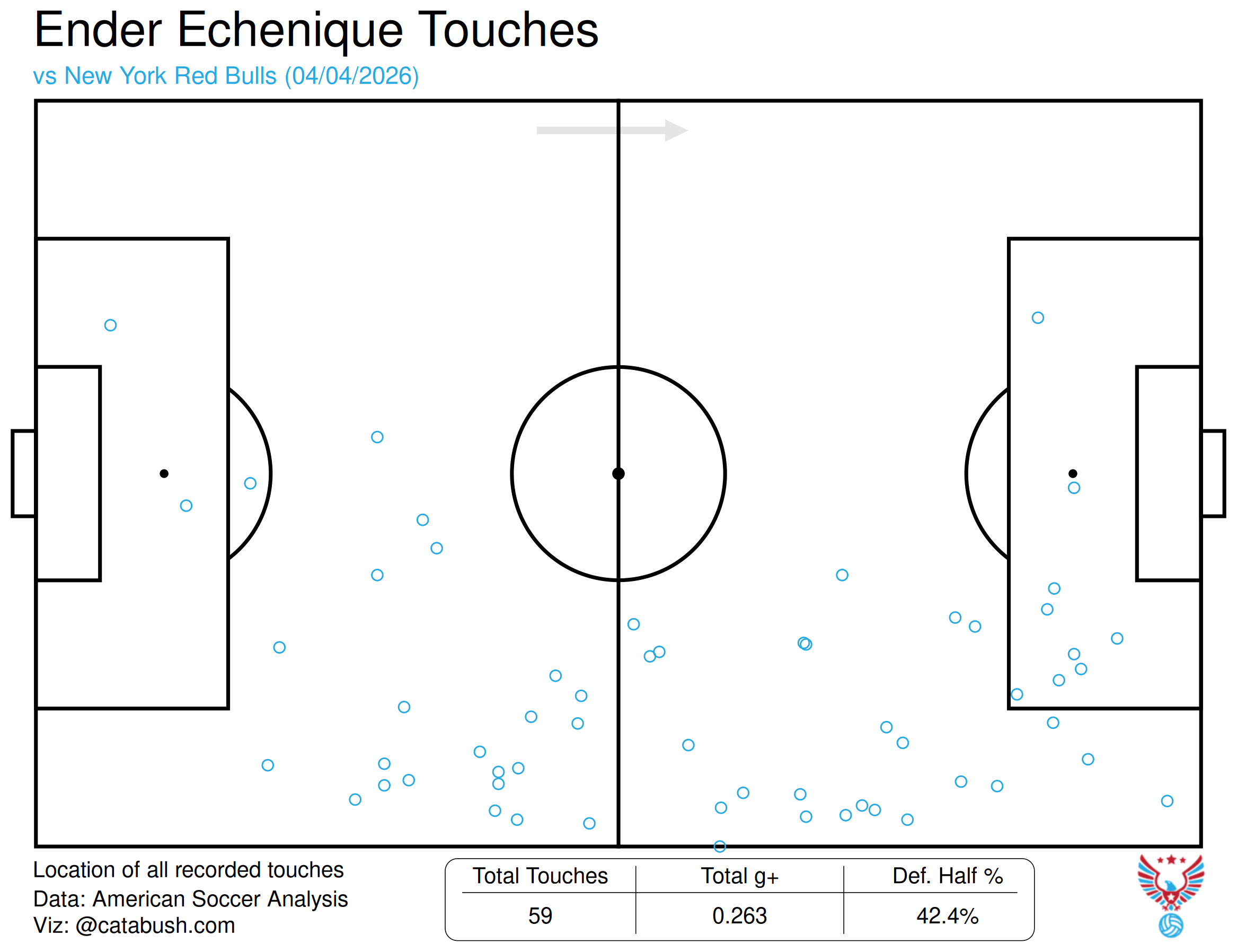 Let's start with the promising stuff. Simply, FCC's setup prioritized getting it's best attacking players the ball in the most dangerous parts of the field. Echenique, freed of more defensive responsibilities, started closer to the Red Bulls' goal following turnovers. He was consistently dangerous and often had space to exploit as NYRB pushed attacking numbers forward.