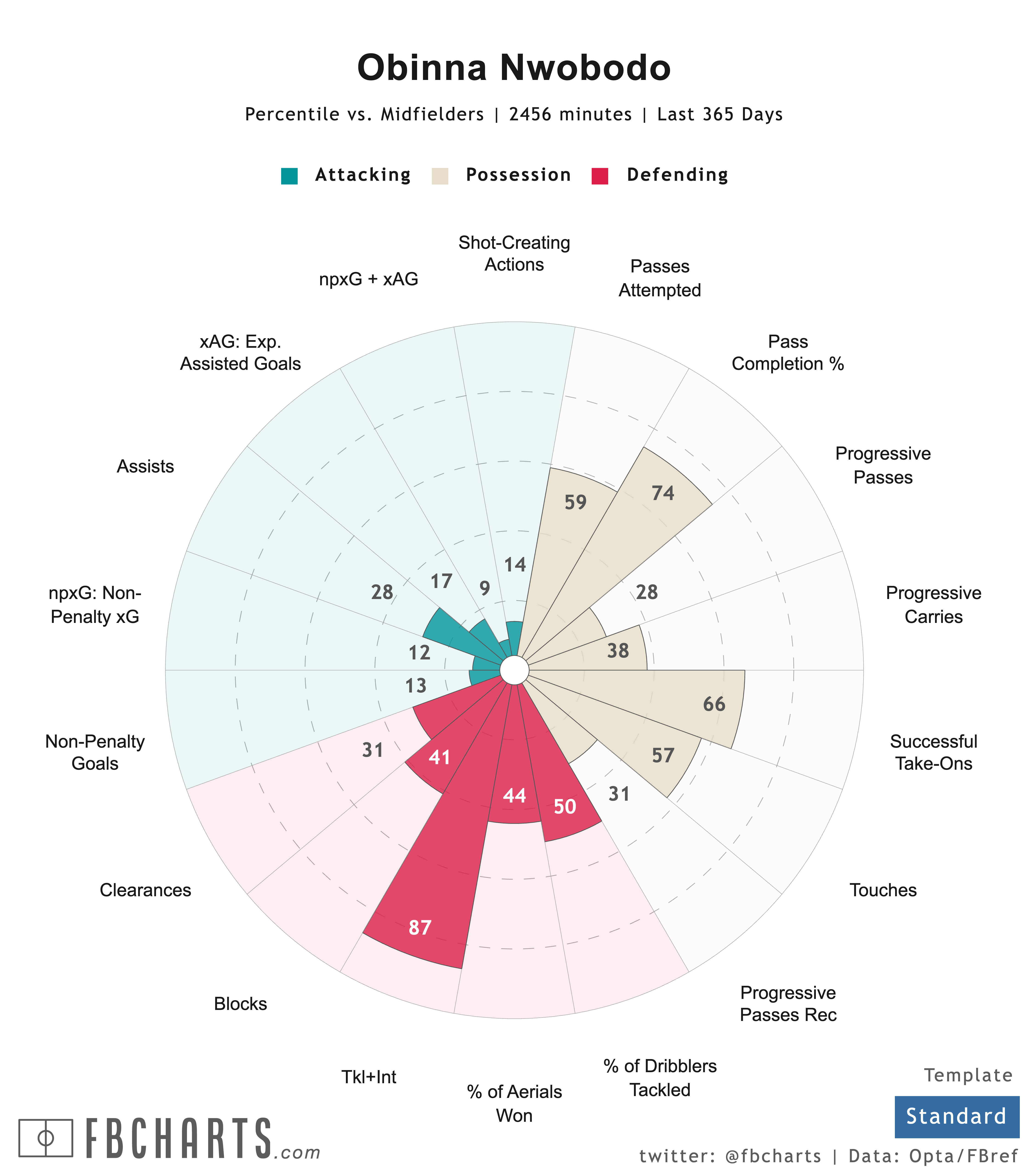 Compared to other midfielders in FBref’s “Next 14 Leagues,” which includes Major League Soccer, Nwobodo’s progressive passes and carries per match rank in the 28th and 38th percentile respectively. He completes a slightly higher than average percentage of his passes, but those passes should be completed at a higher rate because they are generally less ambitious.
